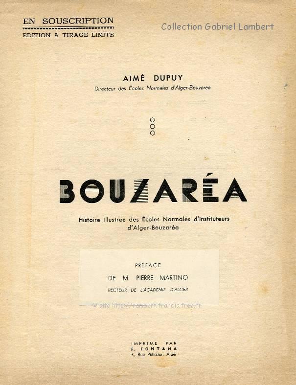 | A l'occasion de la fête du Cinquantenaire des Écoles Normales d'Instituteurs de Bouzaréah, le 10 avril 1938, le Directeur, Monsieur Aimé DUPUY , avait écrit et fait éditer une "Histoire Illustrée des Écoles Normales d'Alger-Bouzaréa". Gabriel Lambert a retrouvé le courrier, avec les pièces qui étaient jointes (maquette de la couverture, pages spécimen, maquette des photos et l'inévitable bulletin de souscription...), qui avait été envoyé à son grand-père, alors en poste à Tizi-Rached en Kabylie |