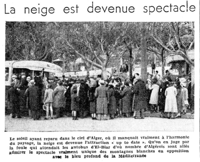 neige est devenue spectacle Le soleil ayant reparu dans le ciel dAlger, où il manquait vraiment à l'harmonie du paysage, la neige est devenue l'attraction "up to date". Quon en juge par la foule qui attendait les autobus dEl-Biar doù nombre dAlgérois sont allés admirer le spectacle vraiment unique des montagnes blanches en opposition avec le bleu profond de la Méditerranée (Echo d'Alger du 1er février 1935) |
