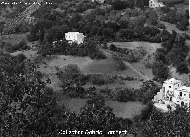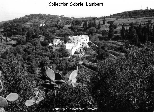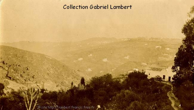 de Gabriel Lambert. Photographie de la famille Croisé, parue dans un journal en 1900 à Alger (mais lequel ?). Il se pourrait cette photographie soit dûe à Mlle Ruperto (photographe d'Alger, probablement même de Bouzaréah) qui était une amie que l'on voyait aux réceptions de Carmen Croisé. J'ai vu, chez ma tante Babiche, un très beau portait que Mlle Ruperto avait fait de Carmen. L'oued qui descend sur Bab-El-Oued prend sa source ici. Les eaux de la colline des Franciscains arrivaient dans un fossé longeant la route de l'Observatoire (celui que l'on voit sur la photo suivante). Le point bas du fossé se trouvait en face de l'entrée de la propriété Croisé. Une buse collectait les eaux qu'elle faisait transiter sous la route et ces eaux descendaient à la mer en passant par le ravin séparant de la propriété Paya, puis le Beau-Fraisier et Bab-el-Oued. Gamins nous jouions à traverser la route en rampant dans la buse. Le ravin, que l'on voit donc sur la photo nous séparait de la Propriété Paya. La buse et le ravin ont été colmatés, une autoroute construite sur l'oued à Bab-el-Oued avec les conséquences mortelles que ces travaux ont entraîné dans les inondations de novembre 2001. en passant le curseur sur la photographie, si il se transforme en petite main, vous verrez alors apparaître le nom du personnage et localiser la source de l'oued ou le chapeau de feutre |