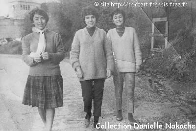 | Danielle Nakache, Laetitia Abensour et sa nièce Jocelyne Taieb, sur la Route Neuve, prés du mur de la villa Barthélémy qui était située à coté de l'épicerie Abensour . |