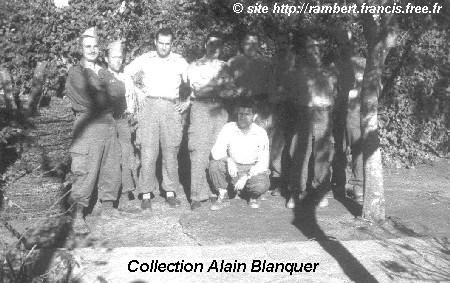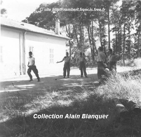 | Difficile de reconnaître sur cette photo d'une partie de pétanque, Alain Blanquer, Ferrer (coiffeur à Bouzaréah, redoutable tireur... à la pétanque !), Bourgoin et 3 territoriaux non identifiés | Auberger (?), Bourgoin et 6 territoriaux non identifiés |