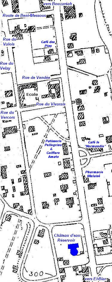Blanquer. Note du site : le plan de 1958 de Théo Bruand permet de situer l'emplacement de ce "château d'eau - réservoir" (dénommé sur d'autres plans "station de pompage"). En réalité il était un peu plus bas que le "Normandie". Quand à savoir s'il existe encore... | ![]() |