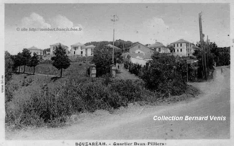 | Sur cette vue du quartier des Deux Pilliers (avec faute d'orthographe !) on distingue effectivement les 2 piliers qui ont donné leur nom au lieu-dit. Elle montre vraisemblablement la route (à droite) qui monte vers Bouzaréah au niveau du carrefour où était situé l'Hôtel-Restaurant "La Résidence" de Mr Bouvard et l'arrêt "Deux Piliers" du trolleybus. |