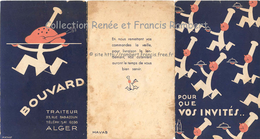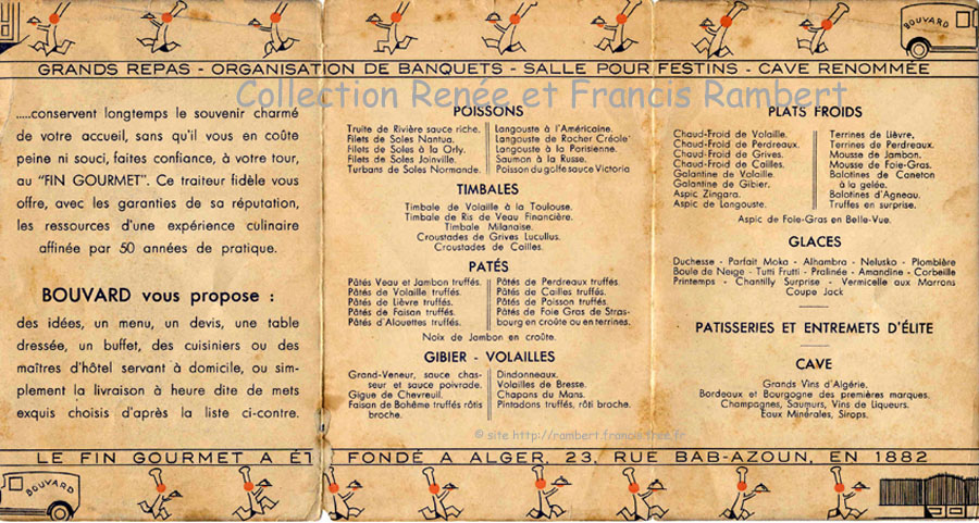 des prestations du traiteur "Le Fin Gourmet" Bouvard avait une boutique de traiteur "Le Fin Gourmet" au 23 de la rue Bab-Azoun à Alger mais aux Deux Piliers se trouvait le restaurant de Monsieur Bouvard "La Résidence" dont la réputation pour l'excellence de sa cuisine s'étendait jusqu'à Alger. D'ailleurs, si, dans la vie courante, quelqu'un trouvait à redire sur la préparation, la saveur ou la présentation d'un plat, il n'était pas rare qu'il lui soit répliqué : "Ma parole ! Tu te crois chez Bouvard !" |
