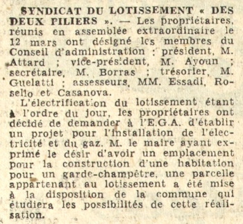 Lélectrification du lotissement étant à l'ordre du jour, les propriétaires ont décidé de demander à lE. G. A. détablir un projet pour linstallation de lélectricité et du gaz. M. le maire ayant exprimé le désir d'avoir un emplacement pour la construction d'une habitation pour un garde-champêtre, une parcelle appartenant au lotissement a été mise à la disposition de la commune qui étudiera les possibilités de cette réalisation. (Echo d'Alger du 18 avril 1950) |