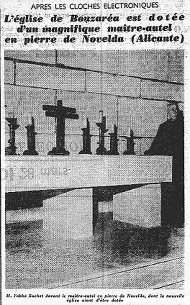 | La nouvelle église, a été dotée d'un maître autel en pierre provenant de Novelda (province d'Alicante). Il est probable que ce soit dû à la générosité d'un donateur bouzaréen (Limiñana ?) originaire de cette région (Article paru dans l'Écho d'Alger du 23 mars 1960) |