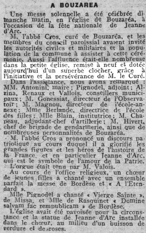 solennelles) ou douloureux (obsèques) du village. Il faudra attendre 1921 pour que l'église Saint-Louis de Bouzaréah soit dotée d'un clocher permettant l'installation définitive de la cloche. La célébration d'une messe solennelle lors de la fête de Jeanne d'Arc, le 8 mai 1921 fut une des premières occasions pour les fidèles et les "autorités" purent assister à une cérémonie dans l'église rénovée et surmontée de son "superbe" clocher, événement relaté dans l'Écho d'Alger du 11 mai. |