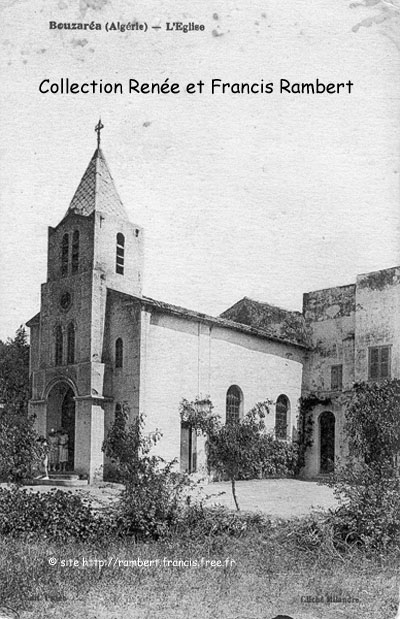 | Le clocher de l'église a finalement été construit en 1921 et il abrite enfin la cloche qui attendait patiemment d'y être installée. Sous le porche, deux paroissiennes attendent peut-être le début de l'office, à moins qu'elles ne papotent longuement à la sortie de la messe alors que la plupart des fidèles sont déjà repartis. A droite, l'entrée de la maison mauresque servant de presbytère menait à une cour intérieure dont les murs étaient ornés d'impressionnants tableaux représentant les portraits de dignitaires et maréchaux de l'Empire, ancêtres plus ou moins direct de l'abbé Suchet. |