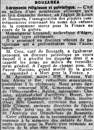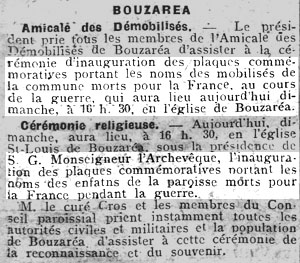 | Cérémonie d'inauguration des plaques commémoratives portant les noms des mobilisés de la commune morts pour la France au cours de la guerre. Ces plaques ont été scellées sur le mur latéral de l'église Saint-Louis de Bouzaréah (articles paru dans l'Écho d'Alger des 6 et 11 juin 1921). A noter qu'on ne parle pas encore d'Anciens Combattants mais de "Démobilisés" | |