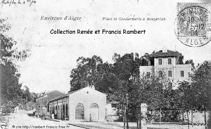 | La route en face conduit, au fond, à droite, au Village Céleste, à gauche, à Notre-Dame d'Afrique. Vu de plus près, le hangar qui n'est toujours pas encore le Café du Progrès puis Café de la Victoire (Maïoné), et à droite, la Route Neuve, la Gendarmerie et la place du village. |