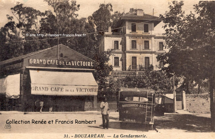 | Sur la place du village, face à la Gendarmerie et au Café de la Victoire (Maïoné), assurant la liaison Bouzaréa-Alger, l'autobus ou autocar n°2, immatriculé en AL3 (donc en 1925) . Peut-être de la Société des frères Cabrera reliait Bouzaréah à Bab-el Oued, terminus au Café de la Butte, avenue de la Bouzaréah, en bas de la "Bassetta" . Ou alors plutôt un bus de la société Bernabeu qui desservait Bouzaréah alors que le tramway des TMS avait son terminus à Châteauneuf ? |