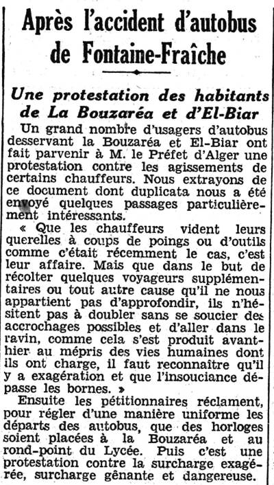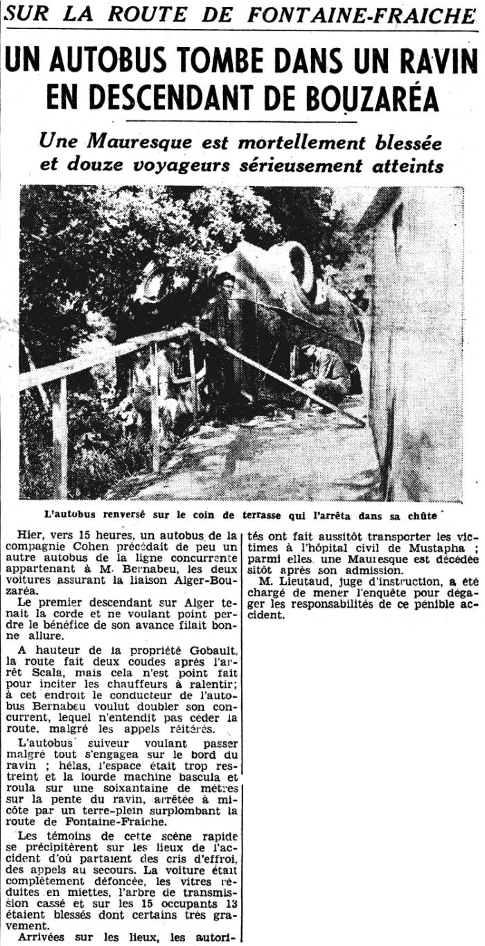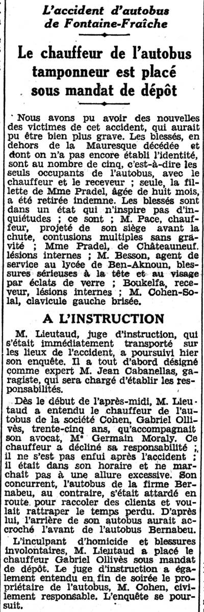 d'autobus de Fontaine-Fraîche Nous avons pu avoir des nouvelles des victimes de cet accident, qui aurait pu être bien plus grave. Les blessés, en dehors de la Mauresque décédée et dont on n'a pas encore établi l'identité, sont au nombre de cinq, cest-à-dire les seuls occupants de l'autobus, avec le chauffeur et le receveur ; seule, la fillette de Mme Pradel, âgée de huit mois, a été retirée indemne. Les blessés sont dans un état qui ninspire pas dinquiétudes ; ce sont M. Pace, chauffeur, projeté de son siège avant la chute, contusions multiples sans gravité ; Mme Pradel, de Châteauneuf, lésions internes ; M. Besson, agent de service au lycée de Ben-Aknoun, blessures sérieuses à la tête et au visage, par éclat de verre ; Boukelfa, receveur, lésions internes ; M. Cohen-SoIal, clavicule gauche brisée. A L'INSTRUCTION M. Lieutaud, juge