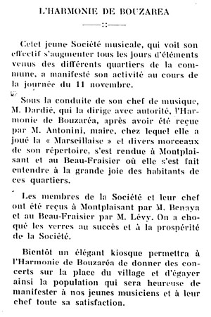 | L'Écho d'Alger du 12 novembre 1933 et le numéro de décembre 1933 de la revue "L'Écho Musical de l'Afrique du Nord" relatent la première sortie pour la célébration de l'Armistice, le 11 novembre 1933, de l'Harmonie de Bouzaréa (qui est vraisemblablement celle dont les musiciens figurent sur la photo ci-dessous) qui ne bénéficie pas encore du kiosque à musique qui sera édifié prochainement sur la place. | |