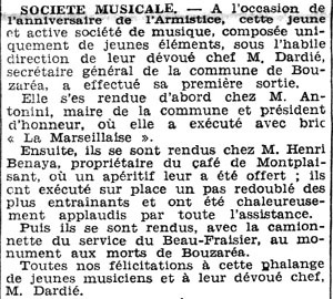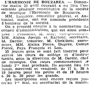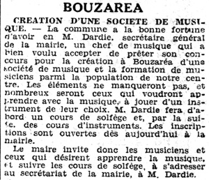 | Initiative en vue de créer une société de musique sous l'impulsion du secrétaire général de la mairie et invitation à s'inscrire aux cours de solfège et d'instruments (Echo d'Alger du 30 mars 1933) | L'Écho d'Alger du 25 avril 1933 relate la tenue, le 23 avril 1933, de l'Assemblée Générale constitutive de la société de musique "l'Harmonie de Bouzaréa" à laquelle sont inscrits 35 jeunes gens. |
