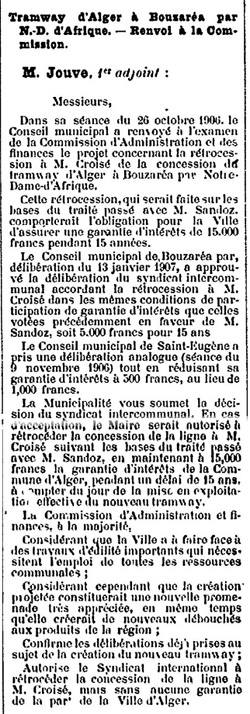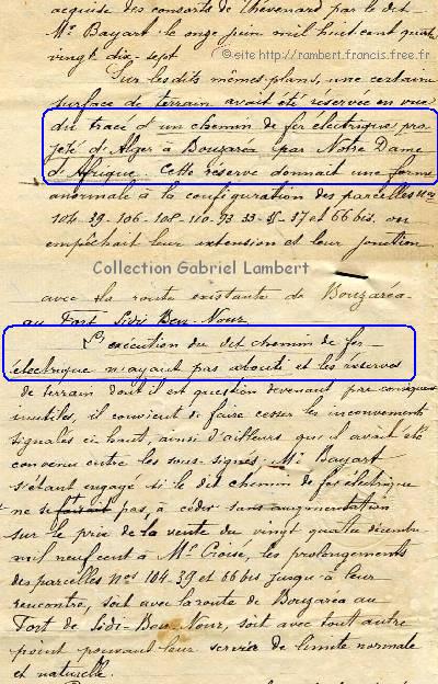 | Acte de vente à Achille Croisé de la propriété, dans lequel il est fait allusion au projet (avorté) de chemin de fer électrique entre Alger (Bab-el-Oued) et Bouzaréah par Notre-Dame d'Afrique | Bulletin