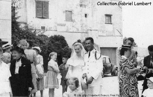 En 1951, devant l'entrée de l'église Saint-Louis de Bouzaréah, lors du mariage de Berthe Lambert avec Vladimir Ragozin, les nouveaux époux reçoivent les félicuitations de Mme Renaux sous l'oeil attentif de Gabriel Lambert (le petit garçon en blanc). |