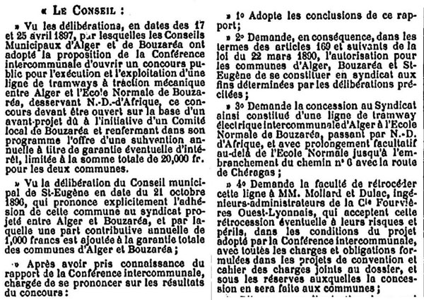 Le délai accordé aux concurrents pour la présentation de leurs projets et études, en ce qui concernait le tracé, le mode de traction ainsi que les conditions financières et autres de l'exploitation, expirait le 31 août. L'ouverture des dossiers contenant les propositions adressées par divers concurrents, eut lieu le 18 septembre. Il y avait trois propositions émanant, l'une de M. Sartor, l'autre de M. Dalaise et la troisième de MM. Mollard et Dulac, ingénieurs administrateurs de la Cie Fourvières-Ouest Lyonnais, représentés à Alger par M. Sandoz, ingénieur des Arts et Manufactures. Lors de la séance du 23 janvier 1897, la conférence intercommunale avait à examiner le rapport contenant ces propositions et décider des suites à y donner,