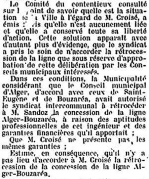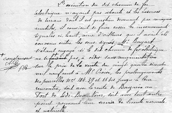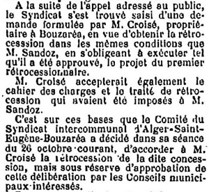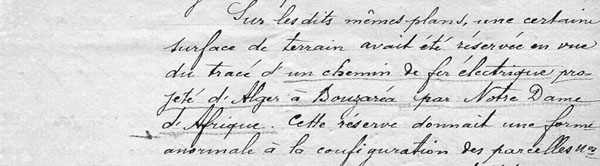 L'exécution du projet de tramway électrique d'Alger à Bouzaréa par Notre-Dame d'Afrique n'ayant plus aucune chance d'aboutir, M. Croisé décida de récupérer, en septembre 1905, les terrains qui avaient été réservés en vue de son tracé, réserve qui donnait une forme anormale à la configuration de certaines parcelles ou empêchait leur extension ou leur jonction avec la route existante de Bouzaréa au fort de Sidi Ben Nour.