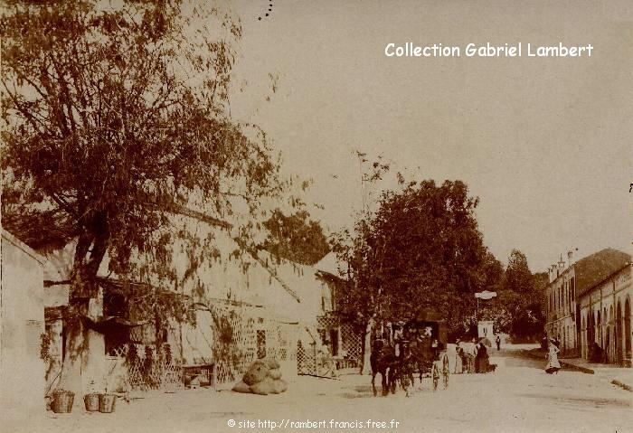 (1915 ou 1916) alors que Jean était encore à Bouzaréah. Au bout de la rue, à droite, la route Beau-Fraisier qui mène à l'Hospice des Vieillards. En face avec l'arbre pointu, la propriété d'été des Baconnier, imprimeurs à Alger. Derrière la dame au parapluie, le puits et à gauche du puits, la route de l'Observatoire qui mène vers le cimetière, le Village Céleste et Notre-Dame d'Afrique. A gauche de la calèche, le futur Café du Centre (certainement pas encore Mercadal). |
