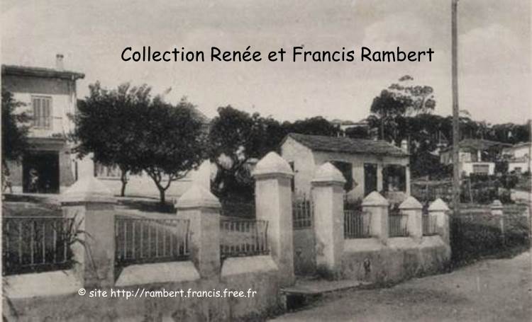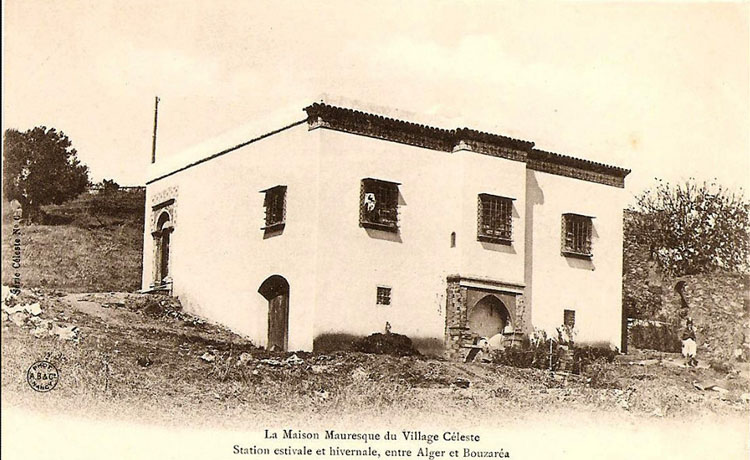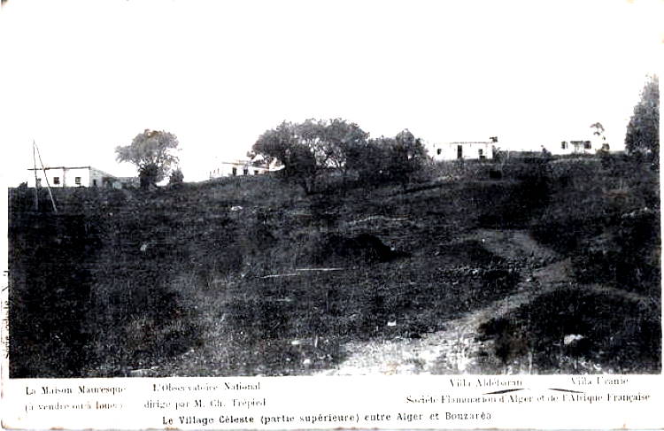Village Céleste (partie supérieure) entre Alger et Bouzaréa Magré la mauvaise qualité de l'image (qui a mal vieilli) on distingue, de la gauche vers la droite, la Maison Mauresque (à vendre ou à louer); visible sur une des cartes ci dessous, l'Observatoire National (dirigé par M. Ch. Trépied), la villa Aldébaran et la villa Uranie, de la Société Flammarion d'Algérie et de l'Afrique Française |
