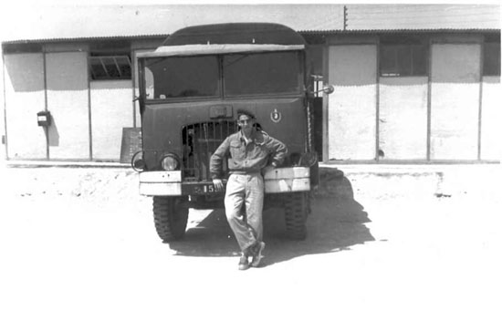 | Au cours du même stage, Francis Rambert et une des Jeeps de l'auto-école pendant l'apprentissage de la conduite automobile | Au cours du même stage, Francis Rambert devant un des camions Simca Cargo dans lesquels nous avions été conduits depuis la Caserne d'Orléans jusqu'au au camp de Beni Messous |