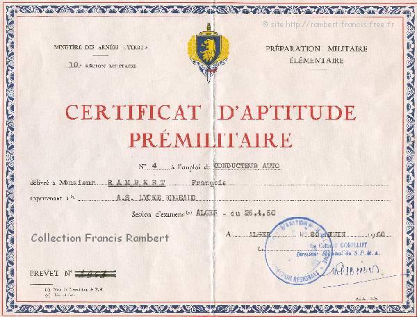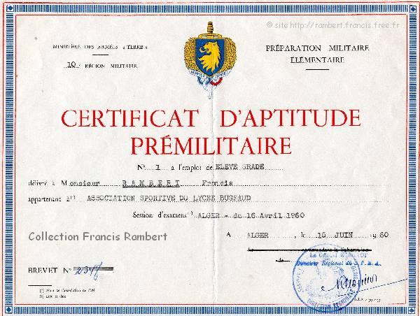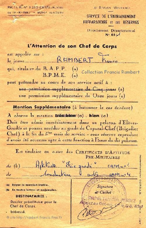 | Une période bloquée de 8 jours (avec parcours du combattant, séances de tir, topographie etc...), effectuée en avril 1960, dans des baraquements du camp Basset, le long de la route menant à l'hôpital de Beni Messous, permettait d'obtenir le "Certificat d'Elève-Gradé" qui donnait droit à un avantage non négligeable, une permission supplémentaire de 11 jours au cours du service militaire |