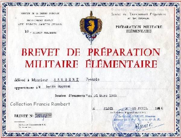 | L'obtention du brevet de Préparation Militaire Élémentaire était indispensable pour obtenir un sursis permettant de poursuivre des études supérieures. Les cours d'instruction théoriques qui avaient lieu, en semaine, en fin de journée, dans les locaux des associations sportives agréées (en l'occurrence au Lycée Bugeaud) et des séances plus "physiques" (parcours du combattant, exercices de tir) se déroulaient le dimanche matin au camp Basset à Beni Messous |
