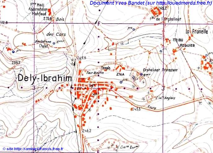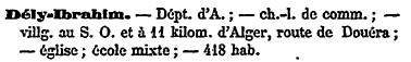 | (Les Guides Bleus "Algérie-Tunisie", 1950) : Dély Ibrahim (260 m. d'alt.), peuplée de 3.100 hab., Monument à la mémoire de Boutin, officier du génie à qui en 1808 Napoléon demanda de faire des observations autour d'Alger, observations qui rendirent les plus grands services lors du débarquement de 1830. Au voisinage, bois des Cars, peuplé de pins d'Alep, de cèdres et de cyprès, au sommet duquel s'érige, depuis 1912, un monument à la mémoire des combattants du corps expéditionnaire de l'armée d'Afrique de 1830, couronné du buste du lieutenant général, duc des Cars. |