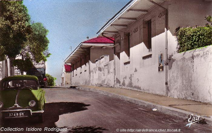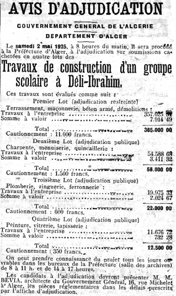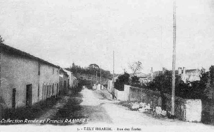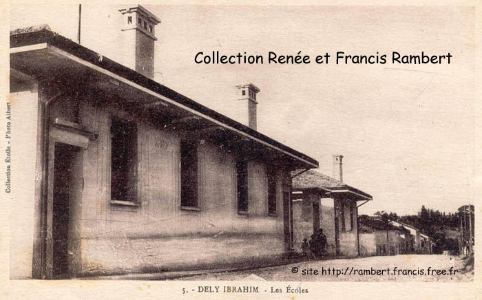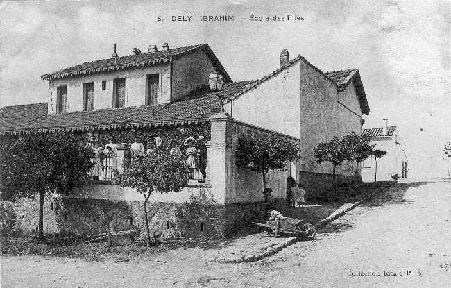 Groupe Scolaire La mise en adjudication des travaux de construction d'un nouveau Groupe Scolaire à Dély Ibrahim date de 1925 (Écho d'Alger du 4 avril 1925). Ci-dessous une vue de ce groupe scolaire dans les années 1950 (provenant de la collection personnelle d'Isidore Rodriguez qui tenait l'épicerie située face à l'église et au Monument aux Morts). La "Dauphine" Renault avec sa plaque 9M (département de Tlemcen) n'a pas été immatriculée dans le département d'Alger (9A). |