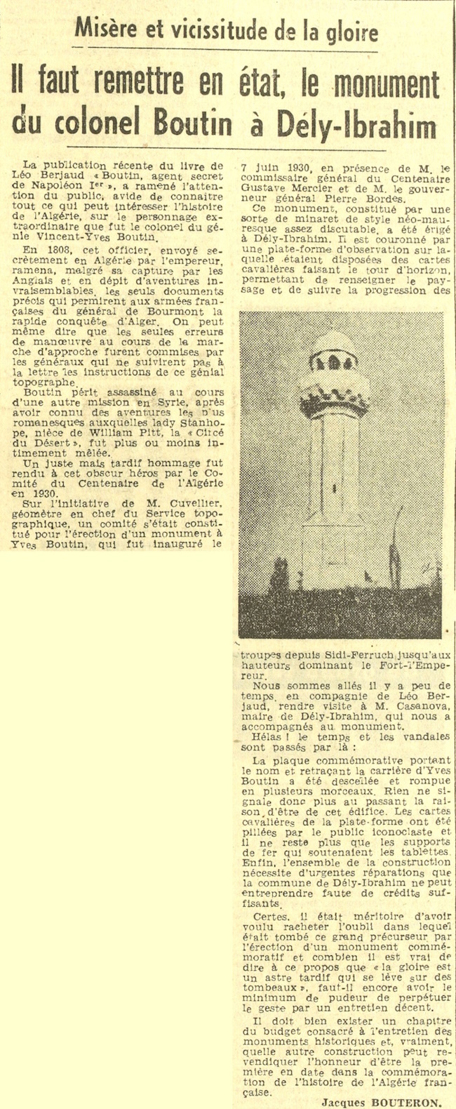 que fut le colonel du genie Vincent-Yves Boutin, Echo d'Alger du 9 février 1952 |