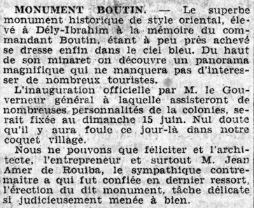 L'Écho d'Alger du 25 juin 1930 informe de le prochaine ouverture au public du monument Boutin |