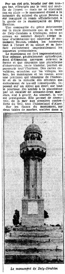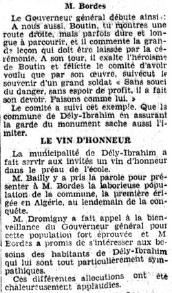 | Inauguration du Monument à la mémoire du Colonel Boutin à Dély Ibrahim le 7 juin 1930 (Écho d'Alger du 8 juin 1930) |