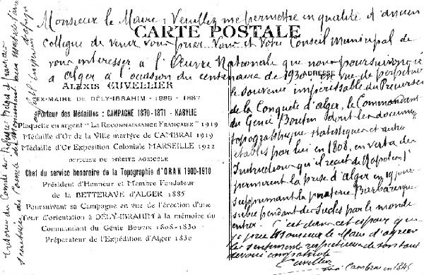 au Maire (de Cambrai ?) Monsieur le Maire, Veuillez me permettre en qualité d'ancien collègue de venir vous prier vous et votre Conseil municipal de vous intéresser à uvre Nationale que nous poursuivons ici à Alger à l'occasion du centenaire de 1930, en vue de perpétuer le souvenir impérissable du Précurseur de la Conquête d'Alger, le Commandant du Génie Boutin dont les documents topographiques, statistiques et autres établis par lui en 1808, en vertu des Instructions qu'il reçut de Napoléon 1er permirent la prise d'Alger en 19 jours supprimant la piraterie Barbaresque subie pendant des Siècles par le monde entier. C'est dans cet espoir que je vous prie Monsieur le Maire d'agréer les sentiments respectueux de son tout dévoué compatriote. Cuvellier, né à cambrai en 1845 Trésorier du Comité des Réfugiés Belges et Français, Secrétaire du Comité du Monument aux Morts de l'armée d'Afrique au Fort l'Empereur |