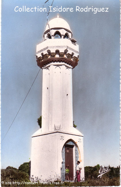 | Tour d'Orientation, élevée à la mémoire du Colonel Boutin, organisateur de la conquête de l'Algérie, sur l'initiative du Comité Boutin (président : M. Bailly), inaugurée en 1930 par M. Bordes, Gouverneur Général et M. Mercier, commissaire général du Centenaire de l'Algérie | Sur cette carte postale provenant de sa collection personnelle, c'est Isidore Rodriguez lui-même qui est photographié devant la porte de la Colonne Boutin. |