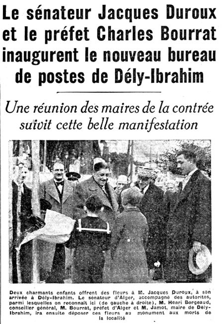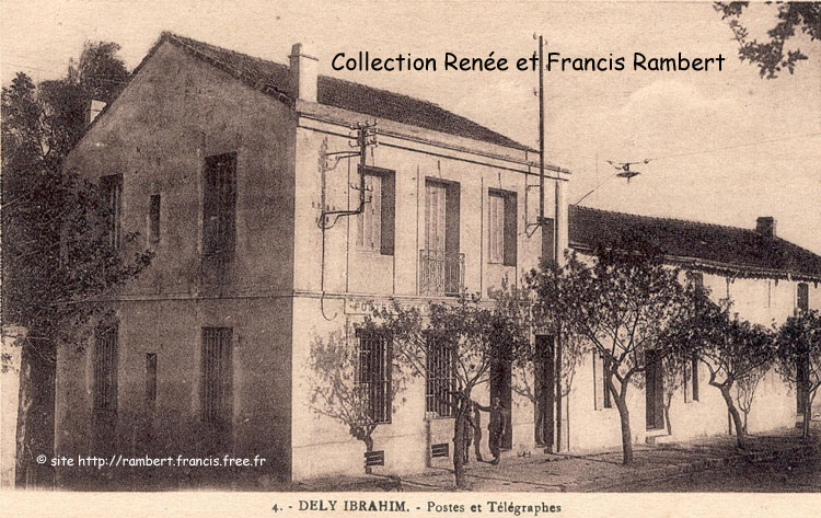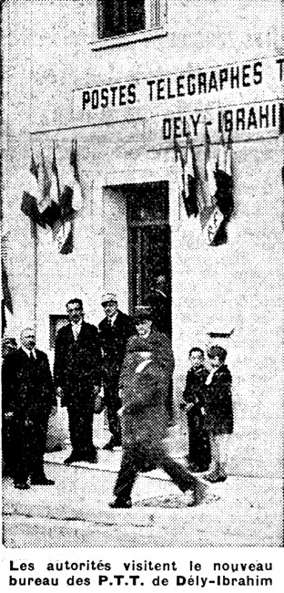 | L'ancien bâtiment fut remplacé par un nouveau bureau des "Postes - Télégraphes - Téléphones" inauguré le 17 janvier 1937 par le sénateur Duroux et le préfet Bourrat en présence du Conseiller Général Borgeaud, du maire de Dély Ibrahim, M. Jamot, et du receveur des Postes M. Baudry (Écho d'Alger du 18 janvier 1937) |