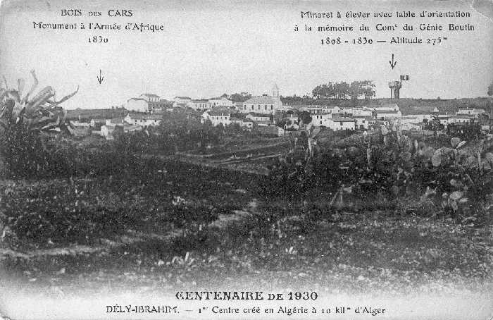 | La carte postale, ci- dessous, d'une série éditée en 1930 à l'occasion du centenaire de la conquête française, rappelle que Dély-Ibrahim fût le premier centre créé en Algérie, à 10 km d''Alger. Il est alors prévu d'élever sur un site à 275 m d'altitude, un minaret avec table d'orientation à la mémoire du Commandant du Génie Vincent-Yves BOUTIN (1772-1815) à qui Napoléon avait demandé de faire en 1808 des observations autour d'Alger, observations qui rendirent les plus grands services lors du débarquement de 1830 . Cette Colonne ne sera finalement érigée que quelques années plus tard. |