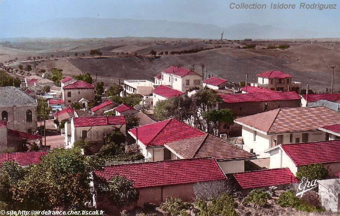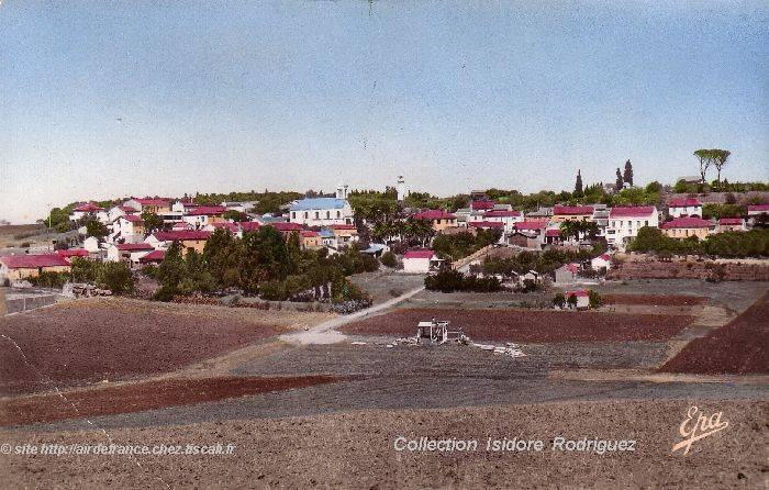 | Enfin, une vue partielle du vaillage, datant des années 1950 et provenant de la collection personnelle d'Isidore Rodriguez qui tenait l'épicerie située face à l'église et au Monument aux Morts. On distingue, à gauche, l'abside de l'église. et plus loin, la route de Douéra avec au fond, le lieu dit "Pic du Grand Vent" et l'éolienne |