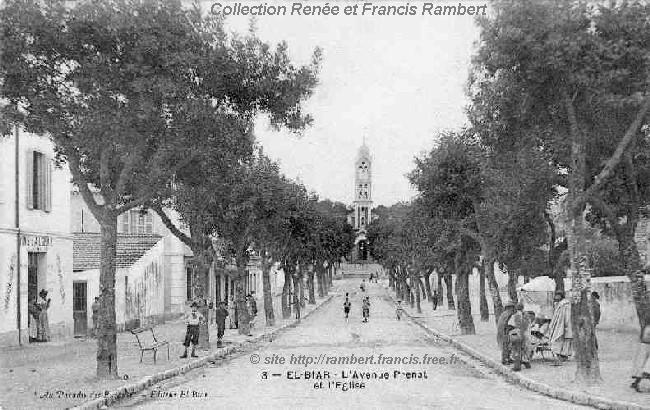 | Depuis le carrefour avec l'Avenue Georges Clémenceau, l'Avenue Prenat (rebaptisée plus tard Avenue Maréchal Bugeaud) conduit à l'église. A gauche, une boutique de "Vins d'Algérie" pratiquant la "livraison à domicile". |
