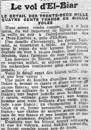 | Un vol de bijoux à l'hôtel-restaurant des "Deux- Entêtés"en février 1919 | |
