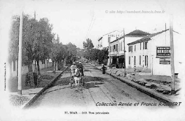 | L'avenue Georges Clémenceau, alors, rue Principale avec des publicités pour l'absinthe "Berger verte et blanche" et pour le chocolat "Grondard". Un peu plus loin, après le café, l'Hôtel "d'El-Biar" ou "de Saint-Raphaël" ou encore "Galian" selon les époques.. |