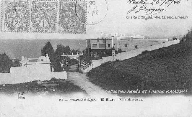 | Renseignements fournis par Émilie : Cette villa se situe au 13 chemin Laperlier (aujourd'hui appelé Sfindja), tout en haut du chemin. La propriété a été acquise par l'état Français en 1937 à M. Lucien Borgeaud et Mme Hermance L'Helgoual'ch son épouse. Jusqu'en 1968, elle semble être connue sous le nom de Dar El Raïs, puis Nedjma par la suite. Elle était constituée de 2 lots. Le premier lot est constitué du plateau sur lequel est contruit la villa ainsi qu'un terrain détaché de la villa St Raphaël (Ex Jardin du Consulat de Suède ou Campagne Cavaillon). Le deuxième lot, sur lequel a été construite en 1958 pour les besoins de l'Etat une deuxième villa, la villa Sfindja, est détaché de l'ancienne propriété Laperlier. Enfin en 1978 a été construite la route reliant le boulevard Gallieni (Bougara) à Laperlier, isolant le terrain et séparant nettement le quartier Laperlier de celui d'El Biar |