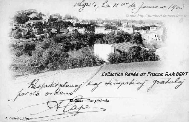 Avant 1903, date d'envoi de cette carte postale, vue du village d'El-Biar, prise des environs de Saint-Raphaël. A gauche, près de l'église, un petit chemin préfigure peut-être le tracé du futur boulevard Galliéni.
