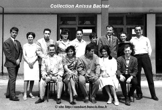 | Pour cette photo, nous avons exceptionnellement dérogé à la règle selon laquelle la période couverte par ce site s'arrête en 1962, à la demande d'Anissa Bachar qui, ainsi que beaucoup de ses camarades, recherche ses anciens professeurs qui se trouvent sur cette photo dans l'espoir qu'eux mêmes ou leurs proches se manifesteront. |