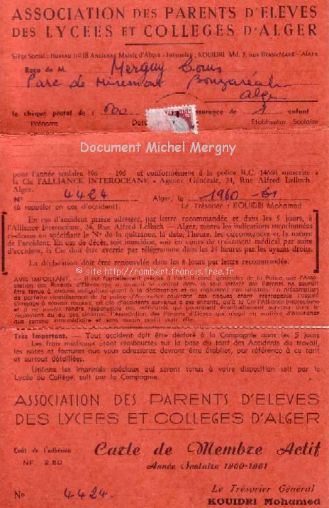 | Ci-dessous la carte de membre de l'Association des Parents d'Elèves des Lycées et Collèges d'Alger, destinée à l'assurance de l'élève |