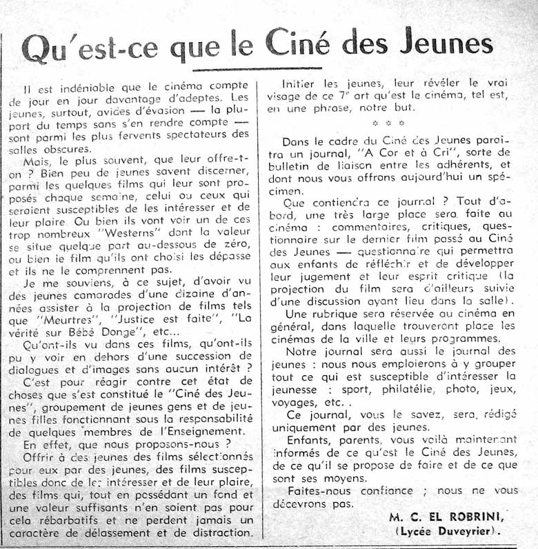 C'est en 1951 que naît le Ciné des Jeunes. Voilà comment un an après, un des fondateurs en célébre le premier anniversaire. |