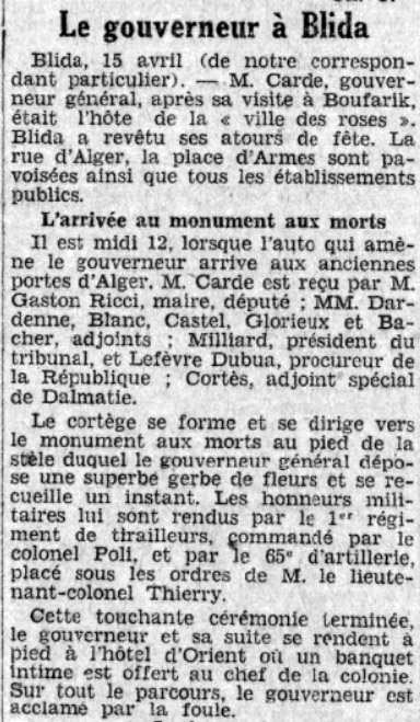 *** Au mois d'avril 1931, c'est au tour du Gouverneur Général de l'Algérie, Mr Carde, de visiter Blida et d'être reçu à l'HO. Il faut ici rappeler que Jules Garde a été élève au Collège de Blida.