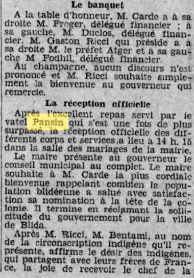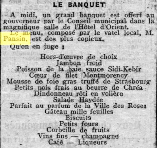 En 1919, changement de propriétaire, c'est Mr Pansin qui prend la direction de l'Hôtel et la qualité reste d'un excellent niveau Le 31/01/1922, c'est la visite du gouverneur Général avec l'inévitable réception et banquet à l'Hôtel d'Orient