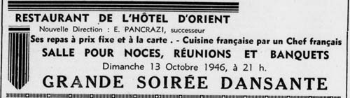 ******************** Cet hôtel restera aussi le lieu où se sont nouées de nombreuses solides et éternelles relations. **************************** Témoignages L'hôtel d'Orient : souvenir inoubliable des bals le dimanche après-midi, accompagnée de mes parents. Divertissement pour les familles attablées, un oeil sur leurs progénitures féminines très sollicitées par la concurrence masculine civile et militaire. Un cavalier attitré pour le boogie boogie, un autre pour le paso doble ou le tango. Quant aux premières notes de musique de l'orchestre Jo Barousse pour le slow, les garçons se précipitaient ....les refus des filles étaient nombreux, ayant l'embarras du choix. "elle est promise" se répétaient jusqu'à l'heureux élu... Premier corps à corps langoureux au son de ...sur ma vie de Charles Aznavour. L.P. Il n'y avait à ma connaissance qu’une salle de danse, on y accédait en prenant un grand escalier qui menait au 1er étage, lieu de la salle en question. Niveau banquets, la croix rouge, bal de la coiffure, des philo-mat, bal du FCB, bal masqué du basket du FCB, bal des blouses bleues de l’école Ducoin-Cormary, bal des conscits....et j’en ai oublié certains. Y.A
