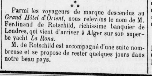 Le Grand Hôtel d'Orient devient un hôtel de grande renommée et il est régulièrement cité dans les différents guides touristiques. "Grand Hôtel d'Orient, rue Bab el Sebt et rue d'Alger, sur la belle place d'Armes, tenu par Monsieur Lebelhomme. Cet hôtel de premier ordre, situé au centre de la ville et à proximité des administrations, offre à MM les1868: Le Grand Duc Alexis de Russie voyageurs, touristes et étrangers, tout le confort désirable. Déjeuners et dîners sur commande et à prix fixes. Salon pour noces et repas de corps. English cook service. (Annuaire François Gouillon -1880) (2)" Le 12 /8/1868 Un banquet est donné à l'Hôtel d'Orient pour le Grand Duc Alexis de Russie