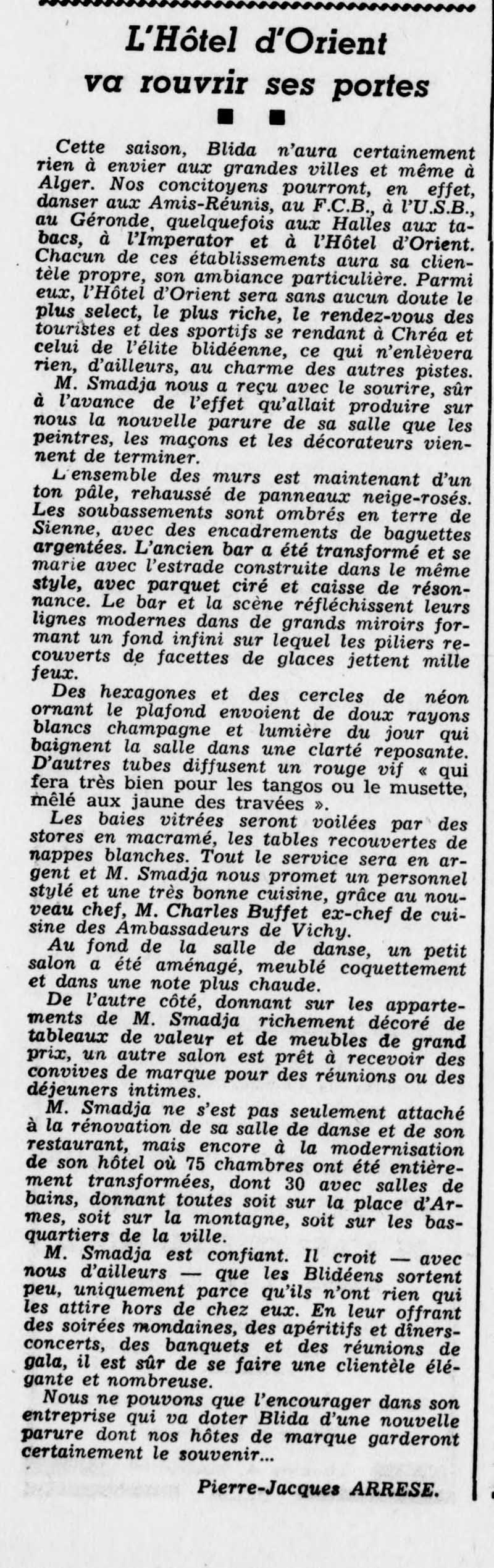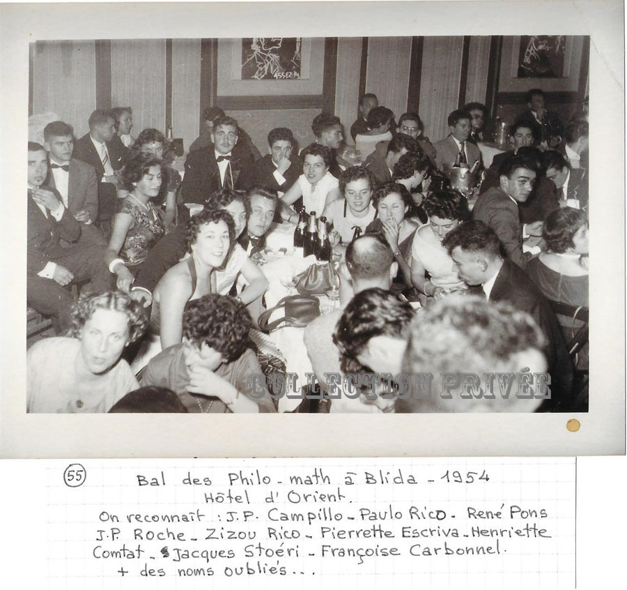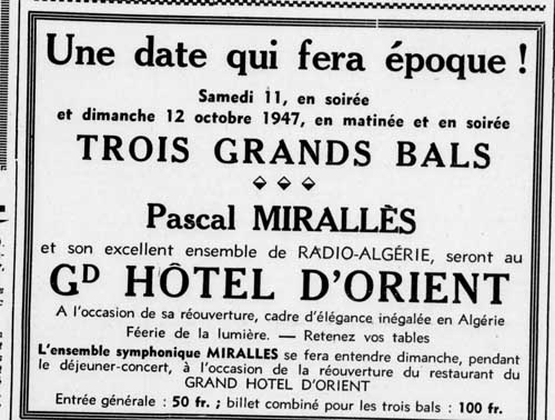 Promotion du bal des Philosophes dans le Tell ou encore une autre année cette annonce parue dans le TELL du 14 janvier 1939 et annonçant le bal des philosophes Bal des philosophes "Le bal des Philo sera certainement la plus brillante des soirées mondaines de la saison blidéenne. L'élegance et le bon goût se joindront le 5 mars à l'originalité Car, au seuil de ce printemps nouveau, les fleurs dont Blida est paré en ce moment mettront leur note ravissante et gaie à la fête. Et dans les luxueux salons de l'Hôtel d'Orient le plus délicieux spectacle s'offrira à la vue des invités. Celui de nos charmantes jeunes filles se livrant à l'art si coquet de la danse sous un dôme de mimosa et de violettes. De plus le comité prépare avec un cotillon et des accessoires supérieurs à ceux du premier bal une surprise aussi plaisante qu'agréable. De sorte que toute la meilleure société de notre cité des roses attend avec impatience samedi soir. Et bien de jolis doigts cousent avec fébrilité des travestis superbes. NB:Il est rappelé que les personnes munies de cartes d'invitation peuvent retirer les cartes d'entrée au Syndicat d'Initiative." ****************** Le TELL du 15/02/1939 **************** Il faut signaler aussi qu'en 40/41, il héberge la commission d'armistice composée d'officiers de réserve italiens. ****** Le TELL du 29/08/1942 *********** Durant la deuxième guerre mondiale un orchestre de jazz américain s'y produit ***************